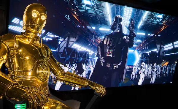 STAR TOURS: o simulador que leva os visitantes a uma batalha no espaço acaba de ganhar novas histórias, trajetos e personagens. A viagem que já era eletrizante ficou ainda melhor com a paresença dos personagens dos novos filmes.